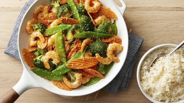 Step3Stir in shrimp and pineapple. Cook 3 minutes, stirring frequently. Reduce heat; stir in sweet-and-sour sauce. Cook 1 to 2 minute, stirring constantly, until shrimp are pink. Serve shrimp mixture over rice.