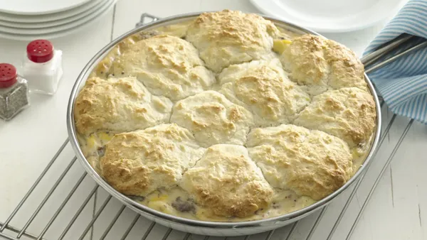 Step4Drop biscuit dough in 8 large spoonfuls onto hot sausage gravy.