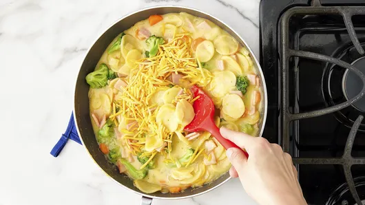Busy day? Let's cook up something simple, tasty and hearty. You may never heat up another frozen meal once you try this recipe. A skillet dish full of ham, au gratin potatoes, broccoli, carrots and onions cooked in a cheesy sauce makes for an easy and delicious weeknight dinner.