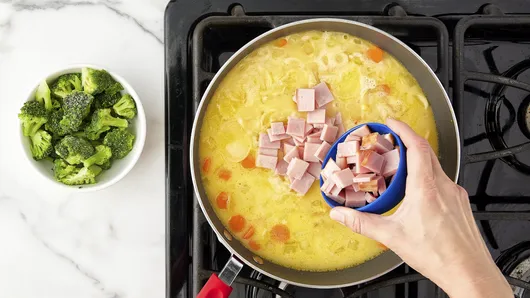 Step2Add potatoes and sauce mix (from box), hot water and milk; stir well to combine. Heat just to boiling, stirring occasionally. Reduce heat. Cover; simmer 10 minutes, stirring occasionally. Stir in ham and broccoli; cover and cook 10 to 12 minutes, stirring occasionally, until potatoes and broccoli are tender.