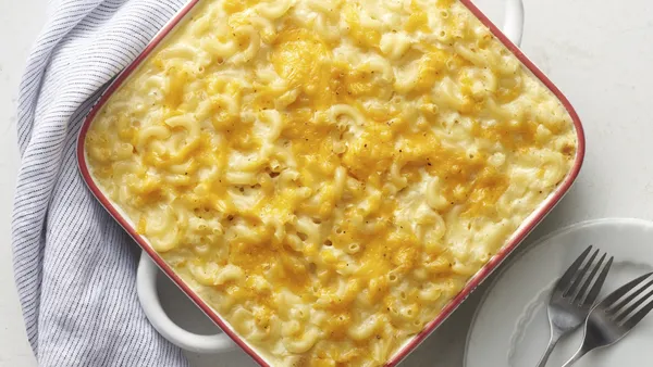 Step2Meanwhile, heat oven to 350°F. Spray 2-quart glass baking dish with cooking spray. In 2-quart saucepan, stir milk, flour, mustard, salt, black pepper and red pepper with whisk until smooth. Cook over medium heat, stirring constantly, until mixture boils and thickens. Remove from heat. Stir in cheese until melted.