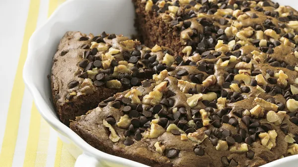 Step2Stir in flour, cocoa, baking soda and buttermilk until well combined. Fold in zucchini, chocolate chips and, if desired, nuts. Spread batter evenly in pan.