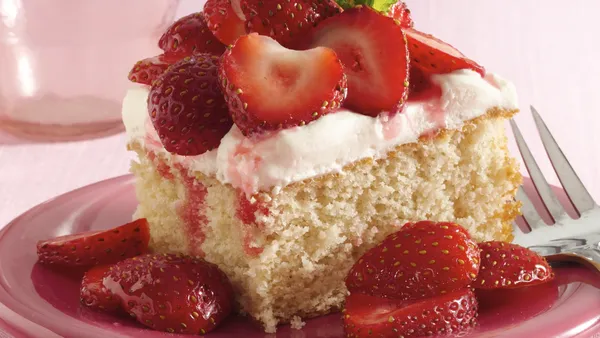 To serve, cut cake into squares; place on individual dessert plates. Top each serving with strawberries and whipped topping.