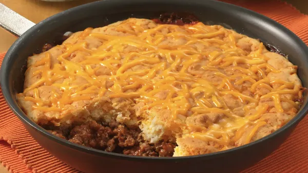 Step2In ovenproof 10-inch skillet, cook beef over medium heat about 8 minutes, stirring occasionally, until brown; drain. Stir in ketchup, salt and tomato sauce. Heat over medium-high heat, stirring occasionally, until hot. Pour Bisquick® mixture over top.