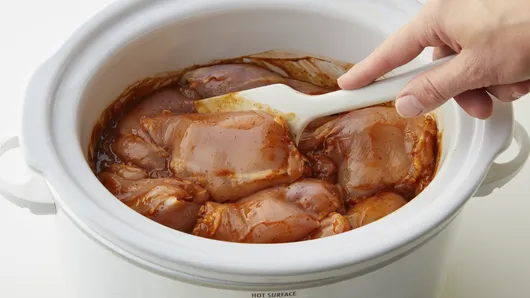 Step4Season chicken with salt; added to slow cooker. Toss chicken with sauce in slow cooker to coat. Cover; cook on Low heat setting 3 hours and 30 minutes to 4 hours or until chicken is cooked through (at least 165°F).