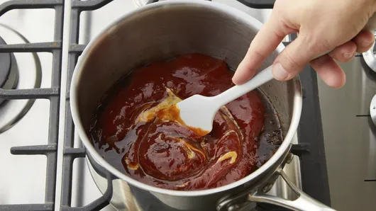 Step3Add garlic, chili powder and pepper flakes; cook and stir 1 minute. Add ketchup, brown sugar, molasses, vinegar, Worcestershire sauce and mustard; heat to boiling. Reduce heat to low; simmer uncovered 10 to 15 minutes, stirring occasionally, until sauce thickens slightly. Remove from heat. Add 1/2 cup of the sauce to slow cooker; cover and refrigerate remaining sauce.