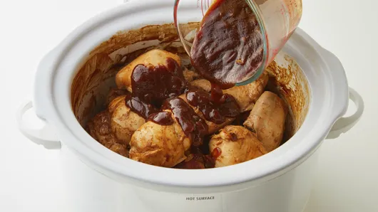 Step5Drain liquid from slow cooker; discard liquid. Pour reserved sauce over chicken; toss to coat. Increase to High heat setting. Cover; cook 15 to 20 minutes or until hot.