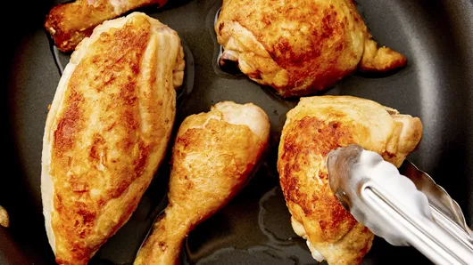 Coat chicken with flour. In 12-inch skillet, heat oil over medium-high heat. Add chicken; cook 15 to 20 minutes or until brown on all sides; drain.