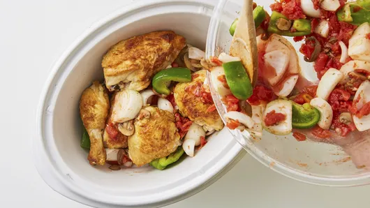 Cover; cook on Low heat setting 4 to 6 hours or until juice of chicken is clear when thickest piece is cut to bone (170°F for breasts; 180°F for thighs and legs). Serve with cheese. Note: This recipe was tested in slow cookers with heating elements in the side and bottom of the cooker, not in cookers that stand only on a heated base. For slow cookers with just a heated base, follow the manufacturer’s directions for layering ingredients and choosing a temperature.