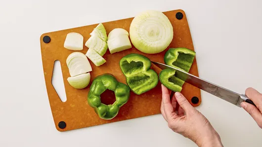 Cut bell pepper and onions crosswise in half; cut each half into fourths.