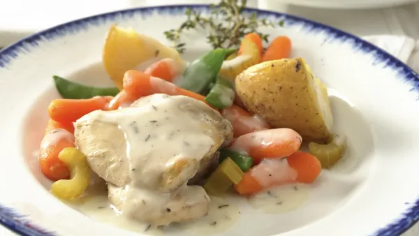 Step4Remove chicken and vegetables from slow cooker to serving bowl, using slotted spoon. Cover with aluminum foil; keep warm. Increase cooker to high heat setting. Mix whipping cream, flour and remaining thyme; stir into liquid in cooker. Cover and cook about 10 minutes or until thickened. Pour over chicken and vegetables.