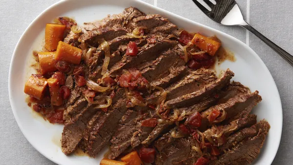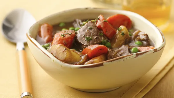Step4Remove beef and vegetables from slow cooker; cover to keep warm. Pour juices from slow cooker into 1-quart saucepan; heat to boiling. Mix cornstarch and cold water until smooth; stir into juices. Cook, stirring constantly, until sauce has thickened. Serve sauce with beef and vegetables. Note: This recipe was tested in slow cookers with heating elements in the side and bottom of the cooker, not in cookers that stand only on a heated base. For slow cookers with just a heated base, follow the manufacturer’s directions for layering ingredients and choosing a temperature.