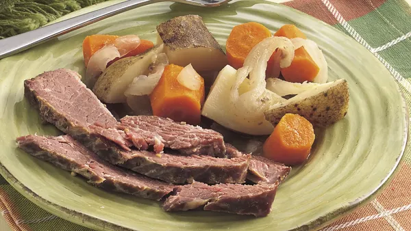 Slow down the kitchen frenzy with a hearty meat-and-potatoes meal that'll have your home smelling absolutely delicious. Savory new potatoes, baby carrots and onions meet tender corned beef brisket to create an easy, delicious dish that family and friends alike will enjoy. Take just 15 minutes to prep this slow-cooker corned beef and vegetables, then let everyone's favorite kitchen gadget do all the hard work!