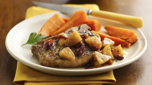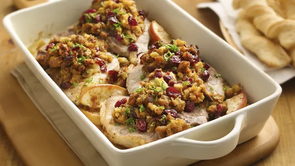 Bring the flavors of fall to your table with a pork chop dinner featuring colorful cranberries and comforting stuffing.
