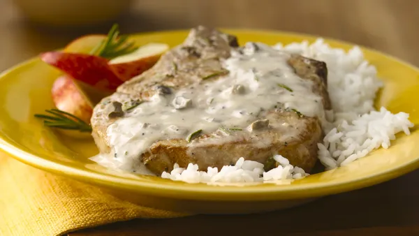 Step3About 30 minutes before serving, make rice as directed on package. Stir together cornstarch and water. Stir cornstarch mixture into mushroom sauce in slow cooker. Heat in slow cooker 5 minutes. Serve sauce over pork chops and rice.