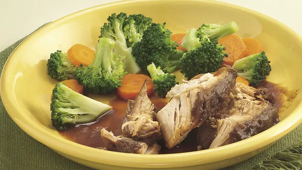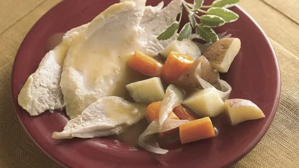 Step3Remove turkey from cooker. Remove skin from turkey breast. Cut turkey into 24 slices; place on platter and cover to keep warm. Pour juices from cooker into 4-cup microwavable measuring cup or bowl. In small bowl, mix cornstarch and cold water until smooth; stir into juices in cup. Microwave uncovered on High 3 to 5 minutes, stirring every minute, until mixture boils and thickens. Serve with turkey.
