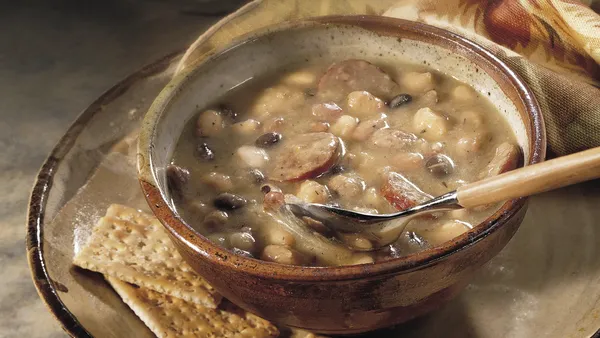 Stock the slow cooker with this smoky sausage and bean soup, rounded out nicely with a complementary selection of veggies and herbs. It takes just 15 minutes to assemble.