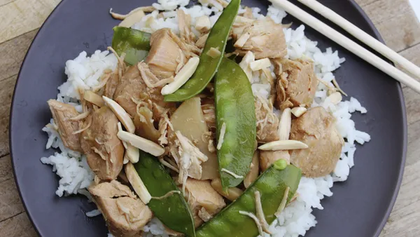 Step4Stir in peas and bell pepper. Increase heat setting to High; cover and cook 15 to 20 minutes or until hot. Sprinkle with almonds and parsley. Rice will hold on Low heat setting up to 2 hours; stir occasionally.