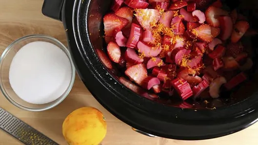 Step1In medium to large slow cooker, toss strawberries, rhubarb, sugar and orange peel.