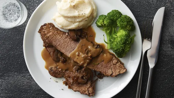 Step3Remove beef to warm platter; cover with aluminum foil. Increase heat setting to High. Beat flour into hot cooking liquid, using wire whisk. Cover and cook 5 to 10 minutes, stirring occasionally, until mixture is thickened. Cut beef into 8 portions; serve with sauce.
