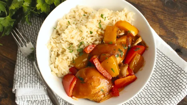 Serve slow cooked sweet chili chicken and bell pepper over rice for a flavorful Asian dinner.