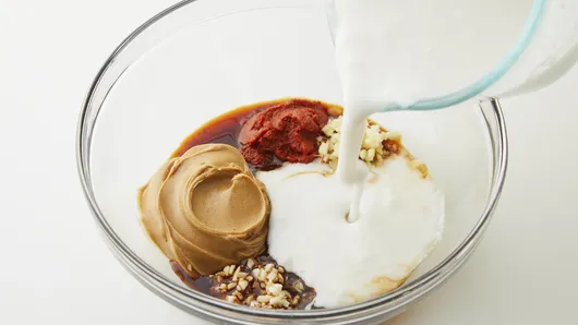 In medium bowl, beat coconut milk, peanut butter, soy sauce, Worcestershire sauce, curry paste, gingerroot and garlic with whisk. Set aside.