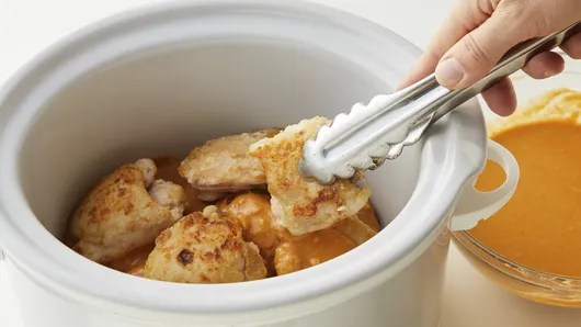 var configuration = {"title":"Slow-Cooker Thai Peanut Chicken","introduction":"Combining sweet, savory and spicy flavors, it’s no wonder Thai Peanut Chicken is a take-out favorite. But here’s a secret: It doesn’t have to come from a take-out box to turn out delicious. You, or rather your slow cooker, can do this dinner at home. Thai cooking is all about combining bright, bold ingredients to create big flavor. Here’s how that works in this recipe. First, simply choosing chicken thighs will start you off in the right direction. Thighs have more fat and turn out tender (not dry) when slow cooked. Second, dredging your thighs in flour and then browning, before slow cooking, develops the flavor of the meat and helps the sauce turn out thick and velvety. Combining standard ingredients—your jar of peanut butter and bottle of Worcestershire—with a few more specialized, but still widely available, ingredients—curry paste (more on that below), coconut milk and fresh ginger—allows you to build the flavor you know and love. Finally, letting all these elements stew together in the slow cooker over low heat melds them together, so you end up with a perfectly balanced and fully flavored dinner.\n","servingSize":"2 Thighs and About 1/3 Cup Sauce","image":{"small":{"media":"(min-width: 0px)","src":"https://mojo.generalmills.com/api/public/content/yukUt5P7m0aSEz9I5Qg9Sg_webp_base.webp?v=4a72e98f\u0026t=e724eca7b3c24a8aaa6e089ed9e611fd"},"medium":{"media":"(min-width: 500px)","src":"https://mojo.generalmills.com/api/public/content/yukUt5P7m0aSEz9I5Qg9Sg_webp_base.webp?v=4a72e98f\u0026t=191ddcab8d1c415fa10fa00a14351227"},"large":{"media":"(min-width: 767px)","src":"https://mojo.generalmills.com/api/public/content/yukUt5P7m0aSEz9I5Qg9Sg_webp_base.webp?v=4a72e98f\u0026t=191ddcab8d1c415fa10fa00a14351227"},"alt":"Slow-Cooker Thai Peanut Chicken"},"contributor":{"label":"By","name":"Betty Crocker Kitchens","profileUrl":"/about-us","displayDate":{"label":"Updated","date":"Dec 19, 2019"}},"ingredientGroups":[{"ingredients":[{"quantity":"1","description":"can (13.66 oz) unsweetened coconut milk (not cream of coconut)"},{"quantity":"1/3","description":"cup creamy peanut butter"},{"quantity":"2","description":"tablespoons soy sauce"},{"quantity":"1","description":"tablespoon Worcestershire sauce"},{"quantity":"2","description":"to 5 tablespoons Thai red curry paste (see Tip)"},{"quantity":"2","description":"tablespoons gingerroot, peeled and finely chopped"},{"quantity":"3","description":"cloves garlic, finely chopped"},{"quantity":"12","description":"boneless skinless chicken thighs (about 2 1/2 lb)"},{"quantity":"1","description":"teaspoon salt"},{"quantity":"1/2","description":"cup Gold Medal™ all-purpose flour"},{"quantity":"2","description":"tablespoons vegetable oil"},{"quantity":"2","description":"tablespoons packed brown sugar"},{"quantity":"1","description":"tablespoon lime juice"},{"quantity":"1/4","description":"cup cilantro leaves"},{"quantity":"1/4","description":"cup chopped roasted peanuts"}]}],"steps":[{"description":"Spray 4-quart slow cooker with cooking spray."},{"description":"In medium bowl, beat coconut milk, peanut butter, soy sauce, Worcestershire sauce, curry paste, gingerroot and garlic with whisk. Set aside.","stepShotImageUrl":"//mojo.generalmills.com/api/public/content/tjbo7FIeCU6tryF7fHGBog_webp_base.webp?v=395540ac\u0026t=51a43a57af4046789e5a7f20567b1195"},{"description":"Season chicken with salt. Place flour in shallow bowl. Dredge chicken in flour. Discard remaining flour."},{"description":"In 12-inch nonstick skillet, heat 1 tablespoon of the oil over medium-high heat. Arrange half of the chicken in skillet; cook, turning once, 4 to 5 minutes or until lightly browned. Transfer to slow cooker. Pour half of the coconut milk mixture over chicken in slow cooker. Repeat with remaining 1 tablespoon oil and chicken. ","stepShotImageUrl":"//mojo.generalmills.com/api/public/content/gp1L6g8vfEexw_yLi2333w_webp_base.webp?v=42e024f7\u0026t=51a43a57af4046789e5a7f20567b1195"},{"description":"Transfer to slow cooker, and pour remaining half of sauce over chicken.","stepShotImageUrl":"//mojo.generalmills.com/api/public/content/y3SUScCIOUabgFSqhwD0xQ_webp_base.webp?v=4b06de3a\u0026t=51a43a57af4046789e5a7f20567b1195"},{"description":"Cover; cook on Low heat setting 2 hours 30 minutes to 3 hours or until chicken is cooked through (at least 165°F). Transfer chicken to serving bowl."},{"description":"Stir brown sugar and lime juice into sauce in slow cooker. Pour sauce over chicken; garnish with cilantro and peanuts. Serve over rice, if desired.","stepShotImageUrl":"//mojo.generalmills.com/api/public/content/UOrCM56qsEG6uXNfZmnF7A_webp_base.webp?v=32b2dede\u0026t=51a43a57af4046789e5a7f20567b1195"}],"tips":[{"title":"","description":"Worcestershire sauce is a savory, fermented condiment made from a base of vinegar, and flavored with anchovies, molasses, tamarind, onion, garlic and other seasonings. It has a tangy flavor, and we use it in this dish, because it has a slight flavor resemblance to the Southeast Asian fish sauce, which has much more pungent flavor and can be more difficult to find on grocery store shelves.","category":"Recipe/Ingredient Facts","tipShots":[]},{"title":"","description":"Thai red curry paste is a spicy, flavorful, wet paste that is made of many ingredients that usually include red chile peppers, lemongrass, spices, lime leaves, cilantro and shrimp paste. It’s often used in Thai curry, sauces and marinades. We used the brand Thai Kitchen™ in testing this recipe. It’s important to note that different brands can have wildly ranging heat levels with some being fairly mild (like Thai Kitchen™) and others being fiery hot. For this reason, we recommend tasting the curry paste before deciding how much to use in this recipe. In most cases, the range will be between the recommended 2 to 5 tablespoons, but depending on the particular brand and your personal prefer