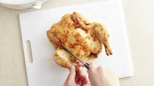 Step3Remove gingerroot, and discard. Transfer chicken to cutting board; let stand about 5 minutes or until cool enough to handle. Cut into 8 pieces.