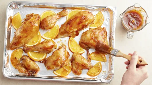 Step5Position oven rack 4 inches from broiling element. Set oven control to broil. Line large rimmed baking pan with foil; carefully transfer chicken, skin side up, to pan. Place orange slices around chicken; brush oranges and chicken with sauce. Broil 3 to 5 minutes or until skin is golden brown and crisp; sprinkle with cilantro, and serve with more of the sauce over rice.
