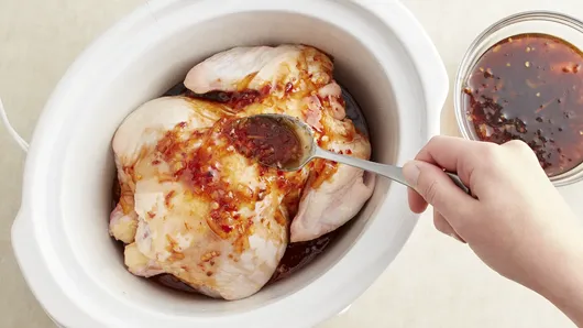 Step1Spray 5-quart oval slow cooker with cooking spray. In small bowl, mix marmalade, brown sugar, soy sauce, chili garlic sauce and salt. Add chicken and marmalade mixture to slow cooker, spreading marmalade mixture over chicken, inside and out. Place chicken breast side down; add gingerroot.