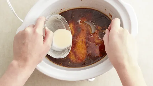 Step4Meanwhile, in small bowl, mix cornstarch and orange juice; stir into liquid mixture in slow cooker. Cover; cook on High heat setting 10 to 15 minutes or until sauce thickens.