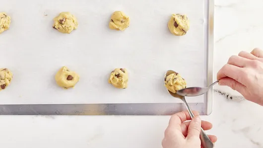 Onto large ungreased cookie sheet, drop 12 rounded tablespoonfuls 2 inches apart.
