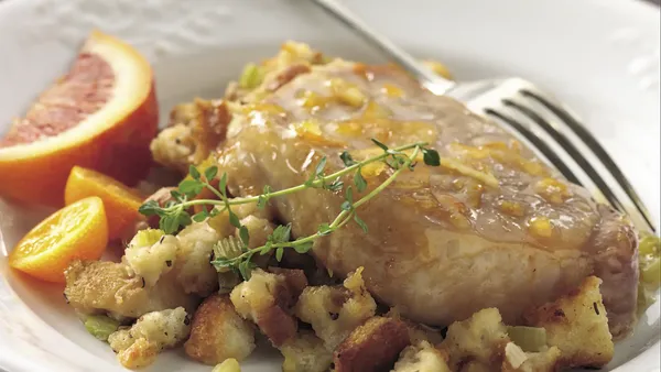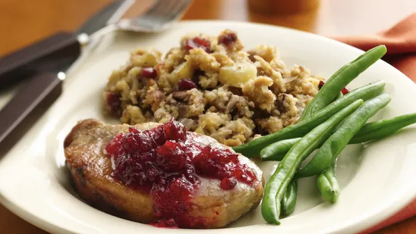 Step3Into 13x9-inch pan, spoon stuffing mixture. Arrange pork on stuffing mixture. Cover pan with foil. Bake 40 to 45 minutes or until cheese is melted and meat thermometer inserted into center of pork reads 160°F.