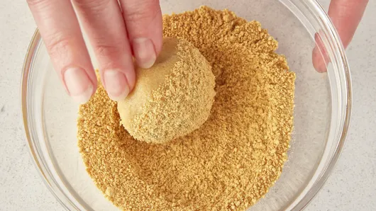 Shape dough into 12 balls (about 3 tablespoons each). Place graham cracker crumbs in small shallow bowl; roll each ball in crumbs. Place 2 1/2 inches apart on lined cookie sheets.