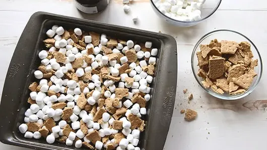 Step4Spread half of the hot fudge topping over top of brownies. Top with broken graham crackers and miniature marshmallows. Set oven control to broil. Broil with marshmallows 4 to 6 inches from heat 2 to 3 minutes or until marshmallows are lightly browned. Drizzle with remaining hot fudge topping. When ready to serve, cut into 4 rows by 4 rows.
