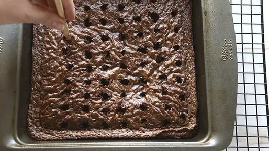 Step2Make brownies as directed on box for 9x9-inch pan. Cool 30 minutes. Use a wooden dowel to poke holes in brownies about 1 inch apart, pushing all the way down to bottom of pan.