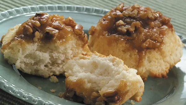 Step4Bake 12 to 15 minutes or until golden brown. Place heatproof serving plate upside down onto pan; turn plate and pan over. Leave pan over biscuits a few minutes to allow brown sugar mixture to drizzle over biscuits. Cool slightly before serving.