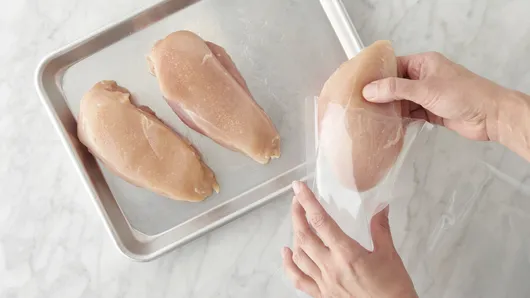 Step2Rub chicken with salt. Place 1 chicken breast in each bag. Seal each bag with vacuum sealer according to manufacturer’s instructions. Refrigerate chicken until ready to use. Once water reaches sous vide machine’s set temperature (165°F), lower prepared bags into water bath, and continue to cook at least 1 1/2 hours and up to 2 1/2 hours. Carefully remove bags from water bath. Cut open bags, and transfer chicken to plate; discard remaining liquid in bags, and pat chicken dry.