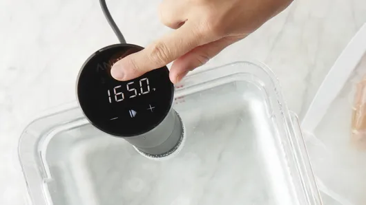 Step1Fill stockpot or deep polycarbonate food-safe container with hot tap water according to sous vide machine’s manufacturer’s instructions. Set sous vide machine temperature to 165°F.