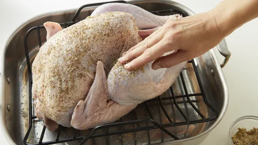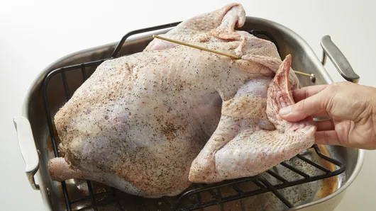 Heat oven to 325°F. Pat skin and interior cavity dry with paper towels. Fasten neck skin to back of turkey with skewer. Fold wings across back of turkey so tips are touching.