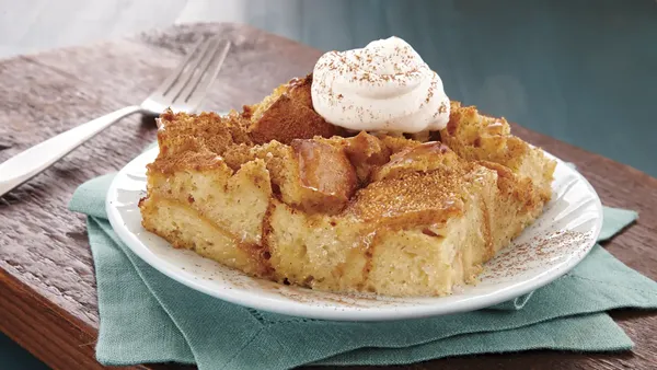 Step4Heat oven to 325°F. Sprinkle coarse sugar over bread pudding. Bake 1 hour 20 minutes or until top is puffed and light golden brown. Cool 5 minutes.