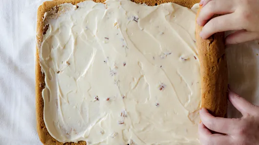 Carefully unroll the cooled cake. Spread the cream cheese filling evenly over the cake. Gently reroll without the towel. Spread the remaining filling over the outside of the roll. Sprinkle with the reserved toasted pecans.