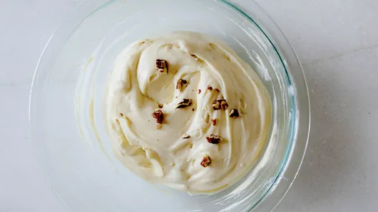 While the cake cools, beat the softened cream cheese and brown sugar until smooth. Gradually add the whipping cream and beat until stiff peaks form. Gently fold in most of the toasted pecans, reserving some for topping.