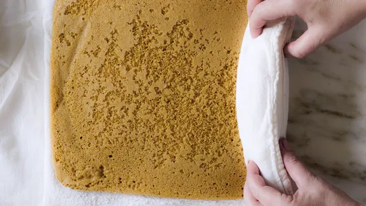 Immediately loosen the cake from the pan edges. Invert it onto a clean kitchen towel generously dusted with powdered sugar (to help the cake from sticking). Remove foil or parchment paper. Starting from a narrow end, roll the cake up tightly with the towel. Rolling while warm prevents cracking. Place it on a cooling rack to cool completely (about 1 hour).