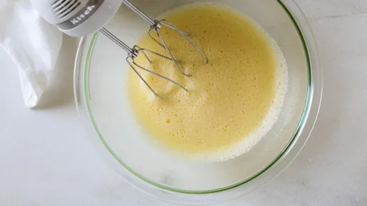In medium bowl, beat eggs with electric mixer on high speed about 2 minutes or until very thick and lemon colored.