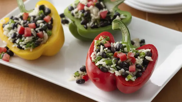 Step2Heat oven to 375°F. In medium bowl, mix sausage, beans, tomatoes, 1 cup of the cheese and the cooked rice. Place pepper halves, cut sides up, in ungreased 13x9-inch (3-quart) glass baking dish. Spoon about 2/3 cup rice mixture in each pepper half, mounding as necessary.
