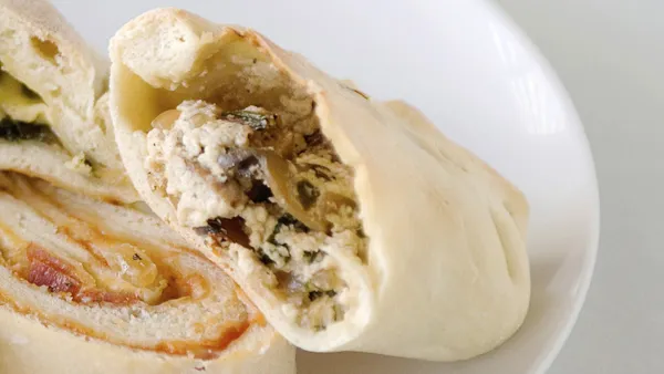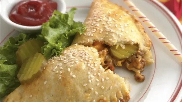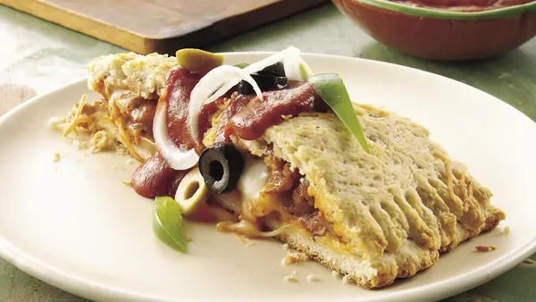 Step3Divide pizza dough into 8 balls. Roll and press each ball into a circle 5 to 6 inches in diameter. Place meat mixture onto one half of each of the balls, leaving a 1/2 inch border around the edge. Fold dough over filling; pinch and roll edges to seal in filling.
