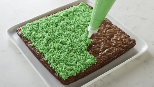 Using foil to lift, remove brownies from pan, and carefully peel away foil. Transfer brownies to serving platter. In small bowl, mix frosting and food color to desired color. Transfer frosting to decorating bag fitted with grass piping tip; pipe onto brownies.