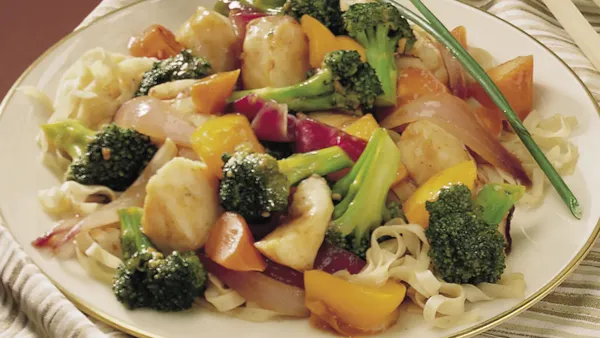Step1Spray wok or 12-inch skillet with cooking spray; heat over medium-high heat. Add gingerroot and garlic; stir-fry about 1 minute or until light brown. Add broccoli, carrots and onion; stir-fry 1 minute.