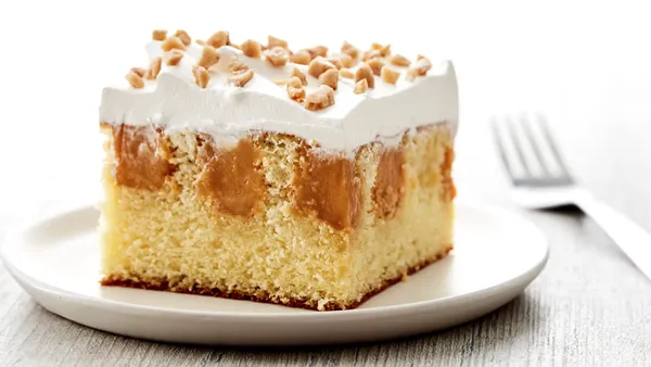 Step3Bake 30 to 35 minutes or until toothpick inserted in center comes out clean. Cool 20 minutes. Poke cake every inch with tines of meat fork or a table knife. Pour syrup slowly over cake, allowing syrup to fill holes in cake. Cool completely, about 35 minutes longer.